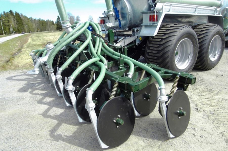 The limits of disc injection stretched with a working width from 3.3 to 5.7 m : from 11 to 19 discs (inter-row 30 cm), special for grassland, possibility of using a grinder-distributor, emptying rate from 5 m³/ha, high quality of work, quality crosswise distribution above 10 m³/ha, side dispersal of slurry up to 15 cm, work depth from 6 to 10 cm, no more odours or nitrogen losses.